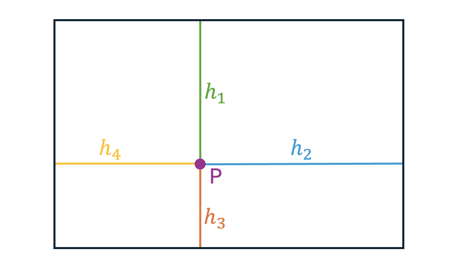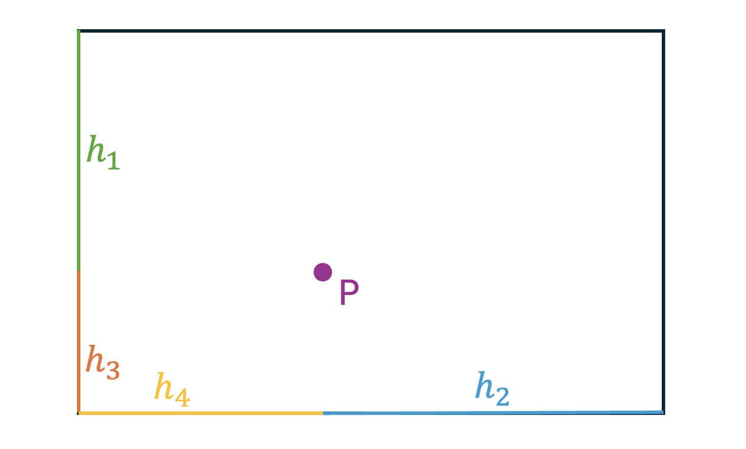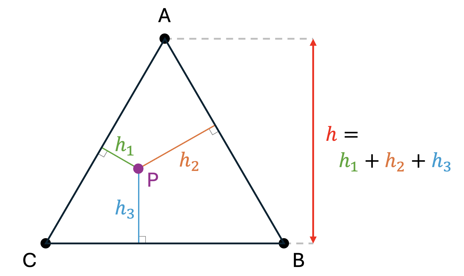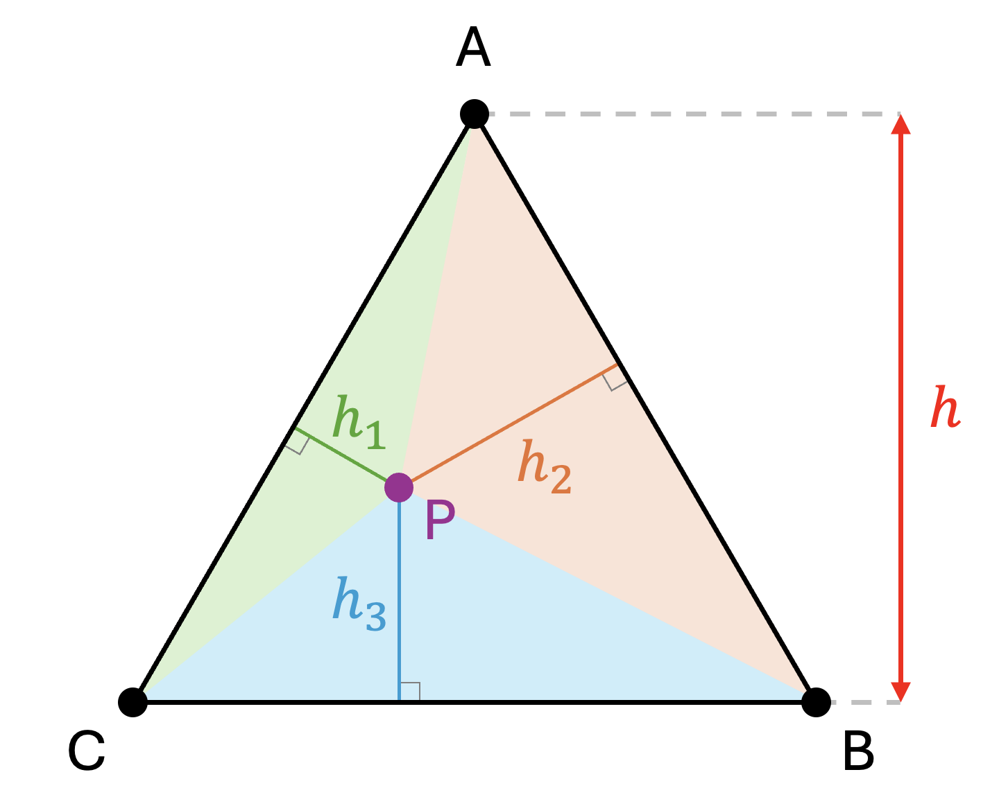 Given an equilateral triangle of side length \(s\), we choose point \(P\) inside, and draw the distance between \(P\) and the 3 sides of the triangle (\(h_1,h_2,h_3\)), the sum of the distances is always the height \(h\) of the triangle.