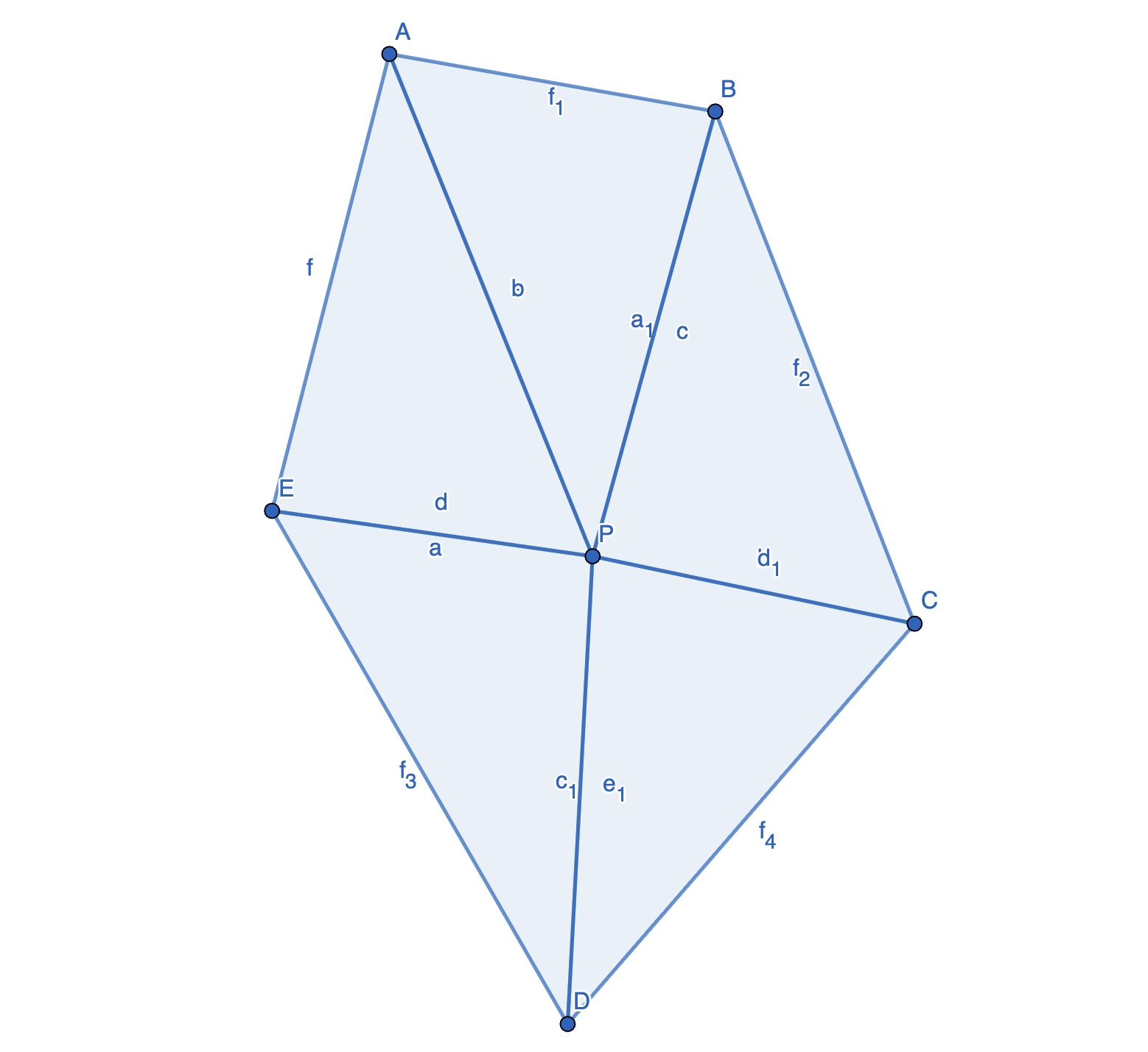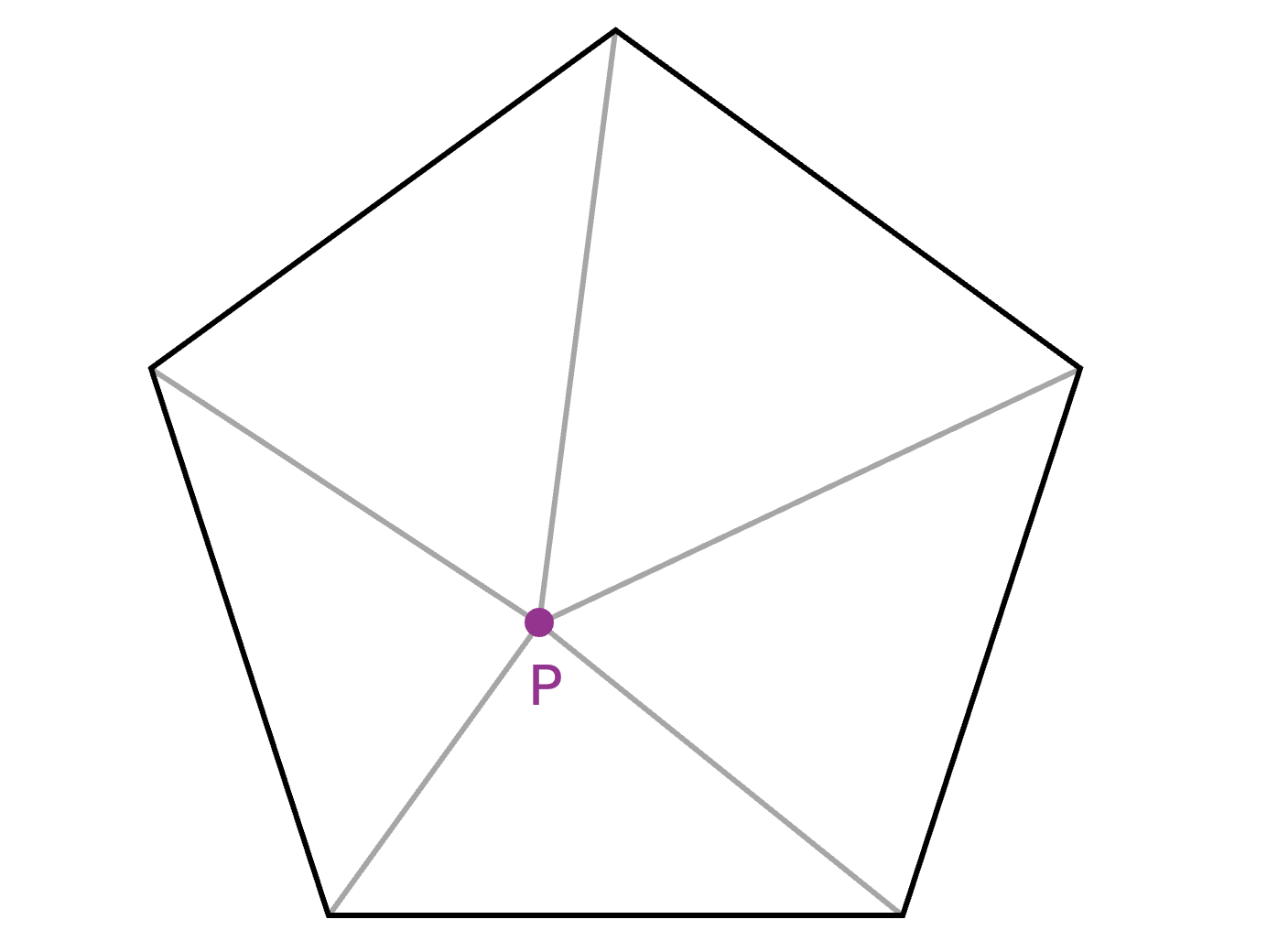 Consider that, given \(P\) inside our polygon, for each side we can draw a triangle connecting the side and the \(P\). So we have as many triangles as the number of sides. For a pentagon we would have 5 triangles:
