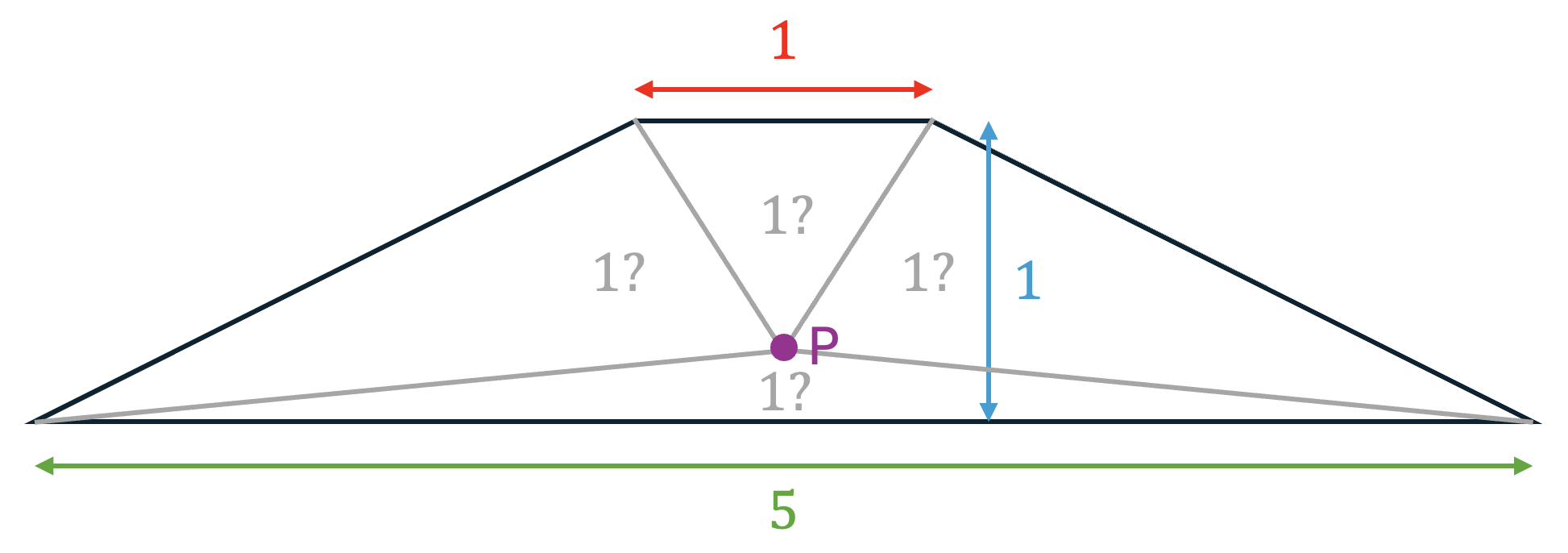 But it is impossible. The upper triangle can have at most an area of \(\frac{1}{2}\), because whenever the \(P\) is, its formula is \(\frac{\text{Base}\times\text{Height}}{2}\), the \(\text{Base}\) is always \(1\), the \(\text{Height}\) is simply "how far is \(P\)", which can move to whatever point in the trapezoid and the \(\text{Height}\) will never exceed \(1\), the height of the trapezoid. Now we have that \(A_{\text{upper triangle}} = \frac{\text{Base}\times\text{Height}}{2} \leq \frac{1\times1}{2}=\frac{1}{2}\), pretty far away form being \(1\).