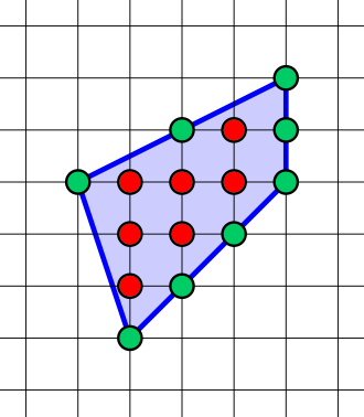 You might ask, how to easily compute the area of a polygon? A famous mathematician called Georg Alexander Pick in 1899 described an interesting result: draw your polygon on a plane where your vertices can only be of integer coordinates: (image from Wikipedia)